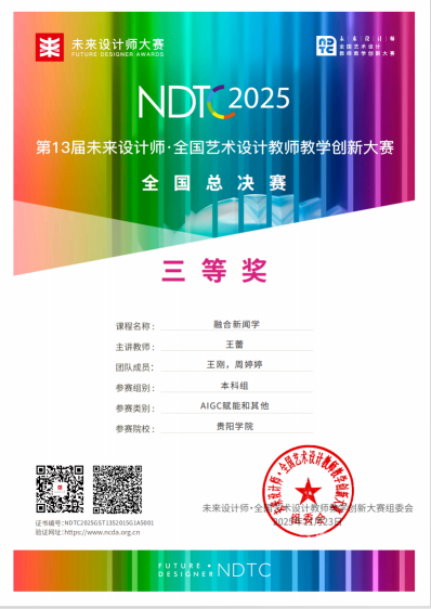 近日,第13届“未来设计师·全国艺术设计教师教学创新大赛”(NDTC)全国总决赛结果揭晓。我院王蕾教授及其团队教授的课程《融合新闻学》荣获全国总决赛三等奖。