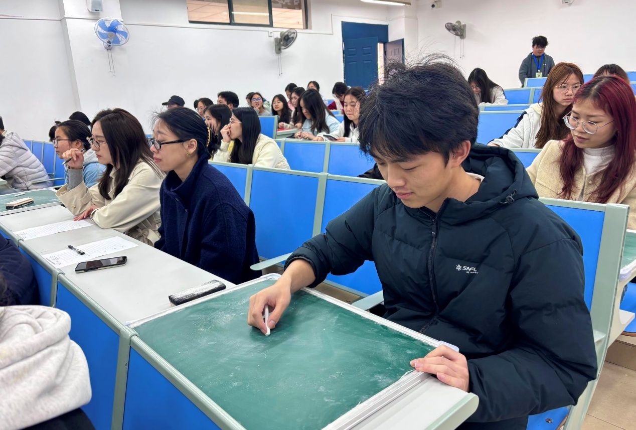 决赛设置“字词辨识”“成语典故”“古诗文接续”三大环节,题目涵盖汉字基础、成语溯源及经典诗词,全面考验选手的文化积累与汉字功底。选手们手持小黑板,凝神听题、认真书写,每一笔都尽显汉字功底;观赛同学全程屏息加油,现场氛围热烈又专注。比赛严格遵循公平公正原则,现场评分、实时核算,全程秩序井然。