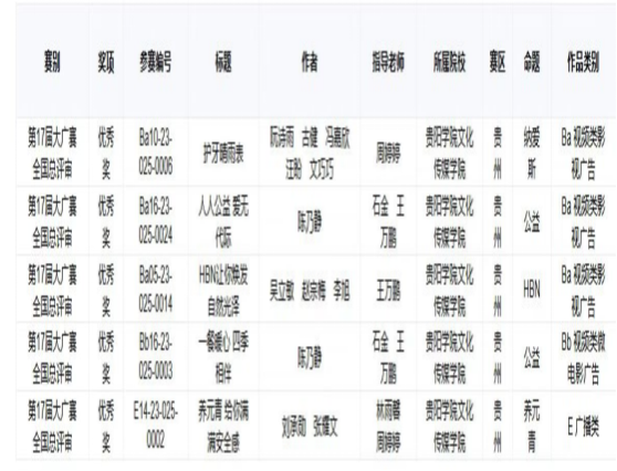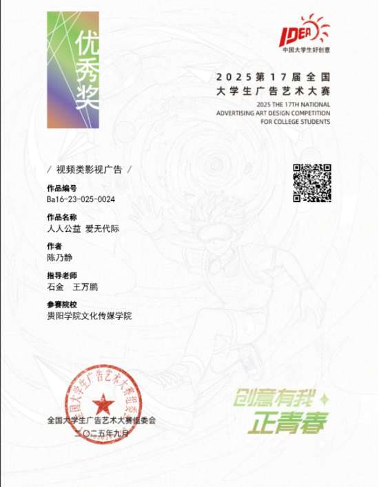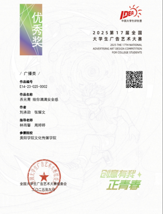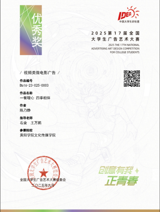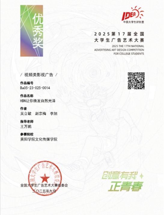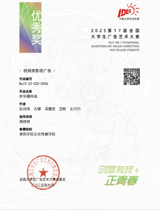 近日,2025年第17届全国大学生广告艺术大赛获奖结果揭晓,贵阳学院文化传媒学院再传捷报。在本次赛事中,广播电视学专业学子凭借扎实的专业功底与创新创意的思维,共斩获了5项全国优秀奖 ,展现出广电学子强劲的实践创作实力。