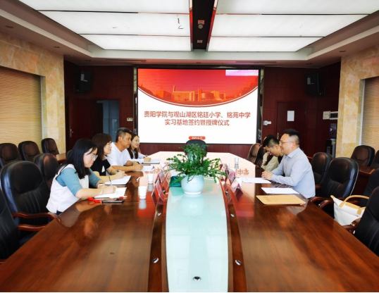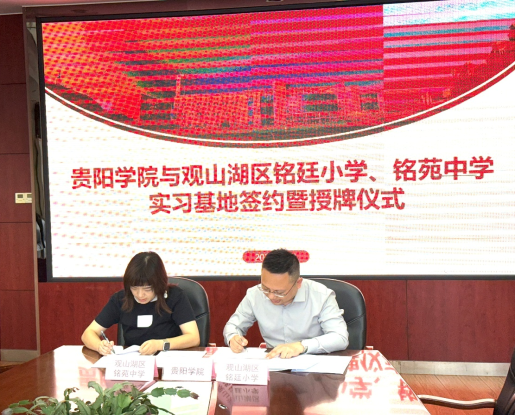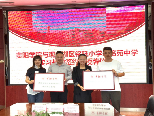 2025年9月23日,贵阳学院文化传媒学院实践教学基地在观山湖区铭廷小学、铭苑中学挂牌。贵阳学院文化传媒学院院长王刚、副院长杨菁、党政办主任石金、副教授姜楠,以及观山湖区铭苑中学和铭廷小学校长胡蓉、副校长孙应权、教师刘淋和廖芳珍参加了签约暨授牌仪式。